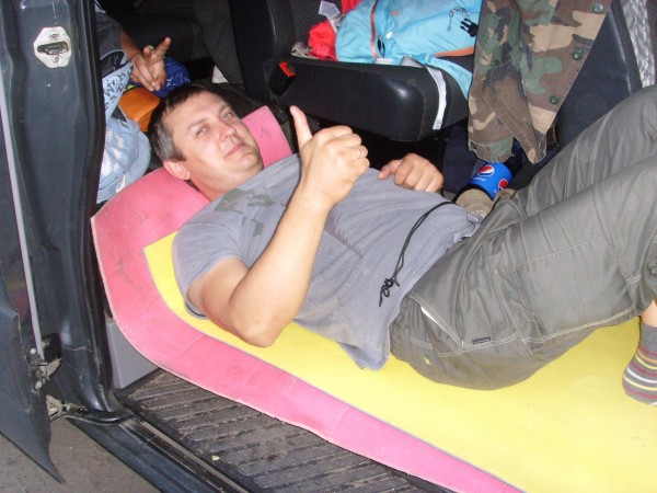 Поздним пятничным вечером я прибыла к месту сбора в гараж Озеринского на Шаранговича. Упаковка буса уже шла полным ходом. Надо отметить, что бус достался нам в аренду благодаря находчивости нашего капитана Славы: именно его зоркий взгляд выхватил из немногочисленных объявлений о сдаче в прокат Mercedes Sprinter цвета мокрого угля. Не знаю, как Славе удалось вытрясти его из владельца – ехать нам предстояло без малого 5000 километров, но вот он – здоровенный микроавтобус, где можно стоять в полный рост и с комфортом разместиться восьмерым путешественникам – стоял у ворот гаража Озеринского и паковался. Провожал нас наш друг Сергей-Борщ, да не с пустыми руками. Взяли магарыч в дорогу. Хозяин похода Саша был суров оттого, что сборы продвигаются чересчур медленно. Остальные понемногу потягивали горячительное, а потому были расслаблены. Наконец сдался и Хозяин похода – за руль сел Слава. Налили и Хозяину похода, от чего сделался он умиротворенным и податливым, расположился на заднем сидении вместе с сыном и не выходил оттуда без острой необходимости до последнего дня дороги.