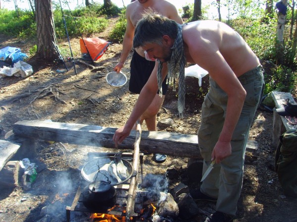Взыграл охотничий инстинкт у Паши и Леши, стали снаряжать удочки. Там же, на стоянке, я нашла утерянную предшественниками серебристую блесну. «Моя блесна фартовая, сегодня у вас точно будет добыча!» - напутствовала я. Провожали рыбаков в несколько этапов. Они как будто специально нарочито долго наматывали лески, приделывали блесну, отираясь при этом возле костра, где гуляла Пузо-кружка. Хозяин похода намек понимал и подливал. Так продолжалось, наверное, целый час. Стоило им отойти на несколько шагов в сторону реки, как кружка призывно плескалась опять. Наконец ушли. Было около 4 утра, я отправилась спать – Хозяин похода любил поднимать всех в 8. С воды раздавались приглушенные разговоры рыболовов и звук разматывания лески. Спустя минут 40 лесная тишина и мерное журчание воды нарушились радостным истошным криком: «Я поймал рыбу! Я поймал рыбу!!! На Белкину блесну!» и агонический смех Леши Горбикова. Моя блесна действительно оказалась фартовой. На утро довольные рыбаки презентовали две рыбины, третью – маленькую щучку – отпустили. Выловленную форель пожарили, предварительно обваляв в муке, что послужило прекрасным дополнением к завтраку.