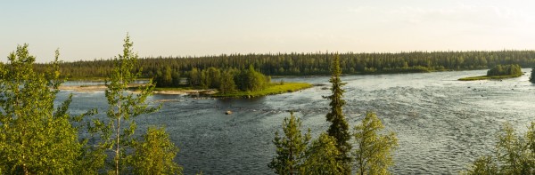 Бурное течение Умбы несло нас к самому первому и сложному порогу Падун. Дело было к вечеру, не верилось, что мы дойдем до него сегодня. «Дотемна дойдем!» - подшучивали все над белыми ночами. Через десять километров и правда послышался раскатистый шум Падуна. Зачалились в тихой гавани на камнях и пошли осматривать порог с берега. Падун бурлил и кипел, мощными волнами огибая камни и разбиваясь об остатки скалы с несколькими деревьями на ней.
