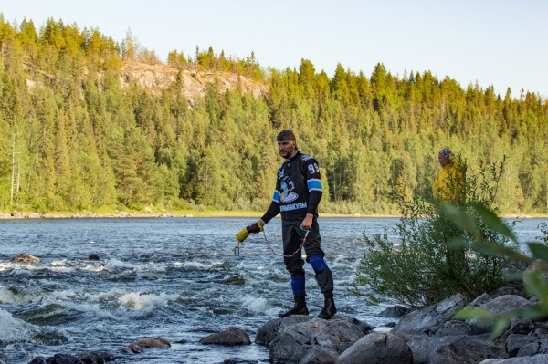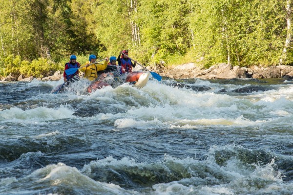 После завтрака отправились навстречу неизвестности. Порог был действительно впечатляющим – вода кипела и пенилась бурунами, длиною он превосходил 300 метров, после чего начиналась спокойная вода. Долго ходили все по берегу, исследуя Паялку и решая, как бы ее лучше пройти. Первой решили отправить байдарку, затем «Умку», а в конце запустили «Кабанчика». Мы с Сергеем встали на фотостраховку.