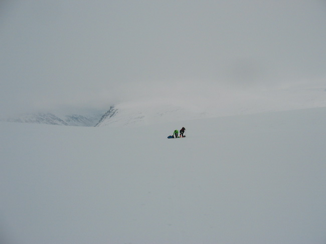 В каких-то полчаса все смешалось в доме Облонских, закрутилось, подул ветер. Полетела снежная крупа, все плотнее и плотнее. Очень быстро стала ухудшаться видимость. Такой вот он у нас непогожий 43-ий поход. Мы упорно и терпеливо продолжали косо подниматься, почти траверсируя пологий склон. Карту понимали и куда идти знали. Но не видно ни хрена, а что поделать. И так продолжался неполный час, пока мы не «стали». Кругом сплошное молоко. Видимость метров сорок. Ветер дул встречный, упруго напористый. Бытует мнение или кажется логичным, что все такое сильное и стихийное продолжается обычно не долго. Пургу решили переждать, сидя на рюкзаках. Сплошное молоко, видимость метров 40.