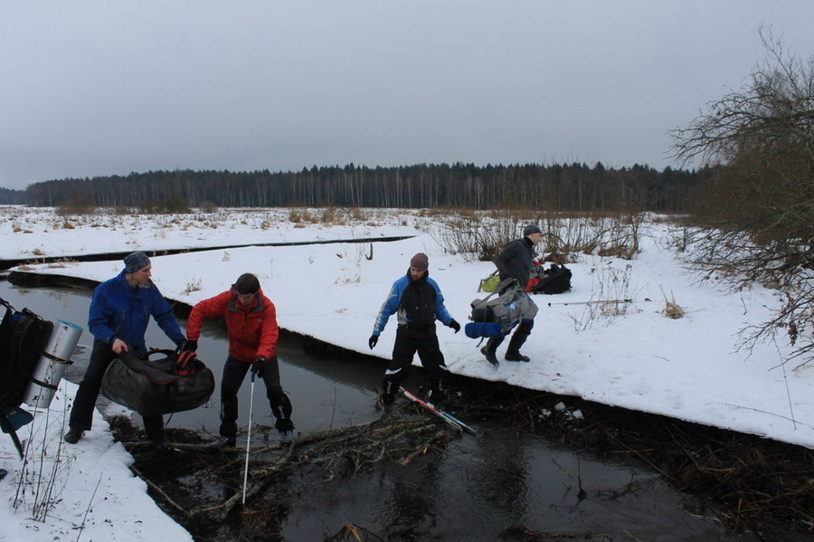 Далее по программе была переправа через реку Смердея. Река оказалась всё же скорее ручьем, запах ее полностью оправдал данное ей наименование. Мощности предшествовавших походу морозов для простой переправы не хватило, река оказалась мокрой.