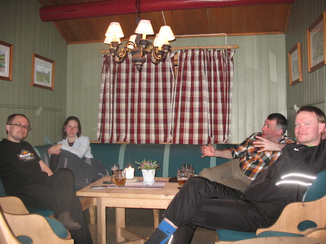 Рядом сидел полный норвежский клон Алены Климович, и, казалось, что вот-вот, и она сейчас заговорит по-русски. Ужин из трех блюд норвежской кухни оказался шикарным. Ресторанного уровня. Рядом с рестораном находилась гостиная комната, где мы, лежа на диванчиках, провели остаток вечера, восполняя водный дефицит, кто чаем, а кто пивом. Рассказывали, как это водится в походах, различные истории около костра. Правда, роль костра выполняла свечка. Про то, как Шел, служа во флоте, участвовал в спасении российской атомной подводной лодки, про рыбную ловлю камбалы и лосося, про то, кто и как нарушает правила дорожного движения, про мусульман и расизм. А закончили разговор политической маевкой.
