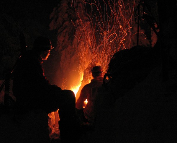 Когда стемнело развели огонь. Ну, сами знаете, огонь — это всегда здорово и получше любого телевизора с новогодними программами. Дров не жалели. Нагрузили бревен с горкой. Согрелись, поели жаренного сала и сами чуть ни поджарились.![]()