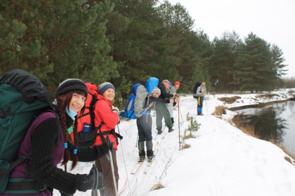 Около 10.00 в составе 12-ти человек высадились на станции Красный Бережок, сделав пересадку в Молодечно. По дороге то и дело слышались разговоры о том, что кто-то что-то да и забыл, в основном поспать. Очень скептично все рассматривали наши с Жанной лыжи, деревянные и ничем не обработанные. Максим Полянский многозначительно сказал: «ну что ж, будем крепиться».