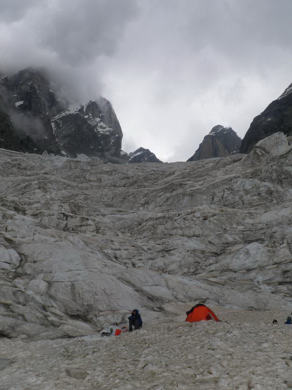 Затем следует перехож через первый ледопад. При достатке времени и лайтовой ходьбе – ночевки на правом (если по ходу – левом) борту над ледником. Живописно и достаточно безопасно. Вот фото тех мест. (на фото – Рома, мой напарник, участник похода)
